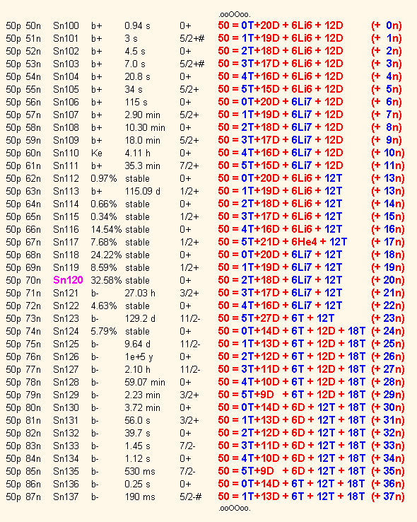 Atomic number of Sn120 = protons (120) - nuclear electrons (70) = 50, with structure 2T+18D + 6 Li7 + 12T.